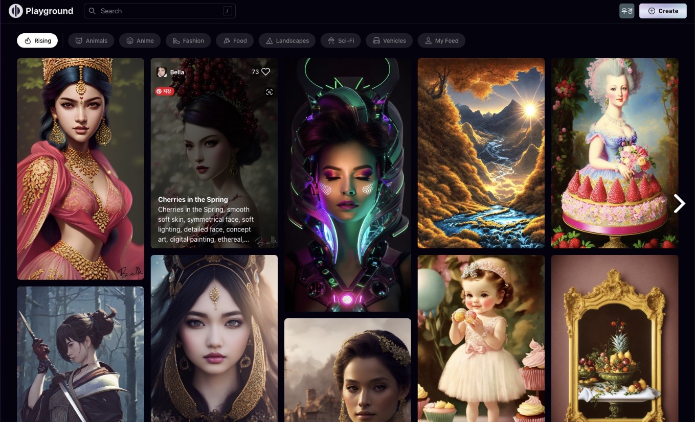 Playground AI는 무료로 사용할 수 있는 온라인 AI 이미지 생성기이다. 예술, 소셜 미디어 게시물, 프레젠테이션, 포스터, 비디오, 로고 등을 만드는 데 사용이 가능하다.