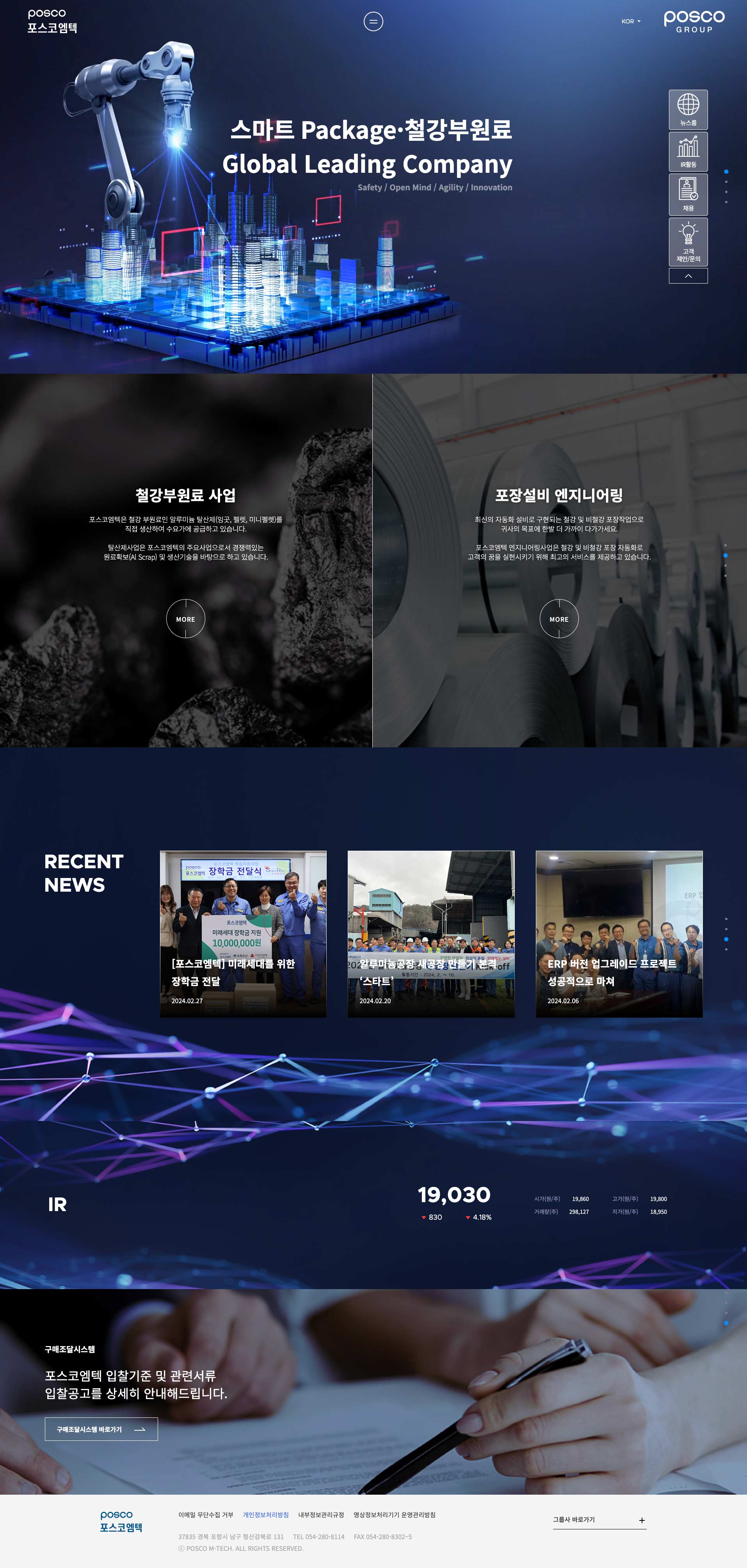 포스코 엠텍 홈페이지 디자인 벤치마킹 분석. 특히 상단 비주얼 이미지 콘셉트와 전반적인 컬러 배색 콘셉트에 중점을 두자.