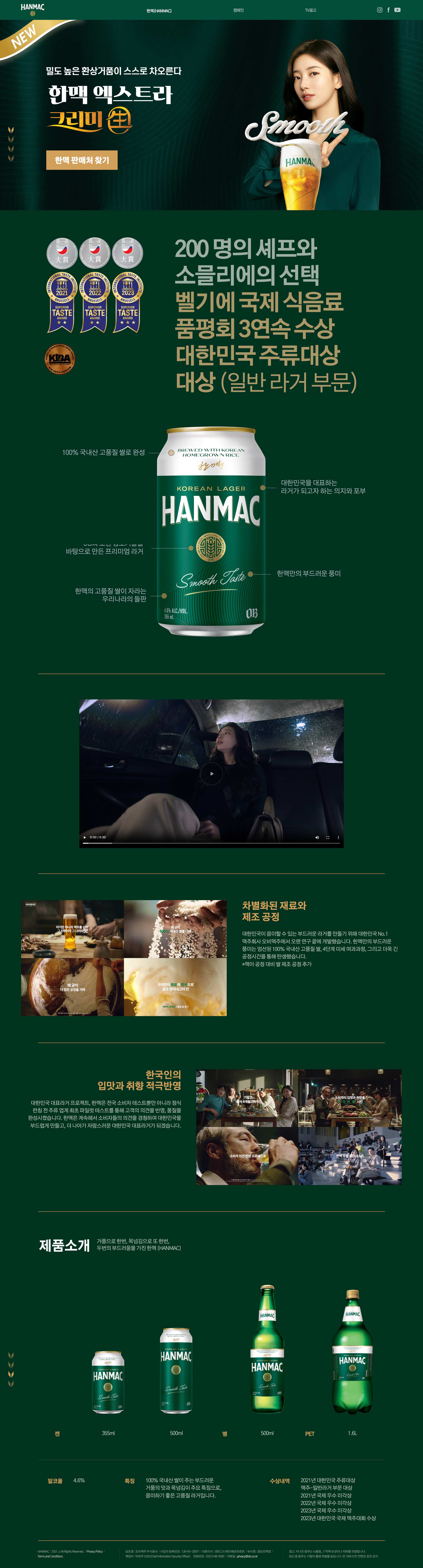 전반적으로 우아한 색상구성과 틀에 구애받지 않는 레이아웃은 한맥 맥주의 프리미엄 품질을 잘 표현한 브랜드 홈페이지입니다.